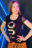 Футболка полуприлегающего силуэта, с округлой горловиной, длиной до середины бедра, с фигурным низом. Рукав втачной короткий, из сетки. Полочка выполнена из двух полотен, наложенных одно на другое. Верхнее полотно из сетки с принтом. Горловина обработана бейкой из основного полотна.