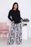 Домашний костюм – это отличный выбор для тех, кто любит активный образ жизни и ценит комфорт в одежде. Комплект состоит из широких брюк с принтом и лонгслива, который не сковывает движений. Состав: 95% Хлопок, 5% Эластан, материал брюк - футер 2-х нитка на резинке. Костюм можно комбинировать, сочетая различную одежду для дома. Пижама с брюками отлично подойдет в качестве подарка на новый год, день рождения, а также для фотосессии. Ее можно подарить маме, бабушке, сестре, подруге, девушке, родным и друзьям. Как любая женская одежда, костюм требует определенных правил ухода: стирка при 30 С, без отбеливания.
