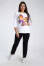 Женский костюм из двух видов ткани (хлопок-верх, с добавлением лайкры-низ). Комплект состоит из футболки с принтом и классических брюк с карманами. Подходит для повседневного использования.