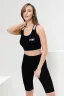 Комплект состоит из топа и велосипедок. Топ на широких бретелях, с округлой горловиной на полочке. В верхней части спинки расположены перекрещенные бретели с отделочными лампасами. Горловина, проймы и бретели обработаны бейкой из основного полотна. Велосипедки облегающие, длинной выше колена, сверху на резинке. Вдоль боковых швов расположены вставки с отделочными лампасы.