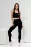 Комплект состоит из топа и леггинсов. Топ на узких бретелях, с округлой горловиной на полочке и вырезом "борцовка" сзади. В верхней части спинки расположена фигурная кокетка с отделочными лампасами и декоративным вырезом. Горловина, проймы и вырез на спинке обработаны бейкой из основного полотна. Леггинсы облегающие, длинные, с завышенным уровнем талии, сверху на широком эластичном поясе. В верхней части боковых швов расположены вставки.