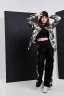 Костюм состоит из рубашки и брюк. Рубашка на кнопках, с отложным воротником, с накладными карманами, с фигурной линией низа. Рукав длинный, на манжете, с застежкой на кнопки. Спинка с кокеткой. Брюки прямые, на поясе, с боковыми карманами, с лампасами из отделочного полотна вдоль боковых швов. В нижней части лампасов обработаны разрезы.