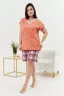 Костюм женский: футболка и шорты. Футболка прямого силуэта с разрезами в боковом шве. Y-образный вырез горловины. Рукав цельнокроеный короткий. На полочке стильный принт. Шорты прямые до колена. Пояс прострочен на многоигольной машине. На передней половинке внутренние карманы. В костюме использовано хорошее сочетание тканей-компаньонов: однотонный персик и клетка.