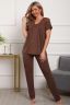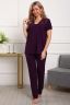 Пижама женская из вискозы. Состоит из туники и брюк. Верх прямого силуэта, чуть расклешённый к низу, ниже середины бедра. Рукав короткий. Горловина V-образной формы, отделана кружевом. Низ прямой. Брюки прямые, зауженные к низу. Пояс цельнокроеный, на естественном месте.