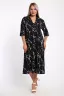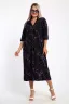 Платье женское свободного покроя. Воротник отложной рубашечного типа, образует V-образный вырез. Платье с карманами в боковых швах. Длина платья чуть выше щиколотки. Рукав 3/4 с манжетой, поднят патой. На моделе представлен 48 размер. Параметры модели: 97-71-101, рост 165 см.