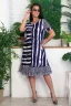 Платье женское, слегка расширенное к низу. Рукав втачной короткий с манжетой. Полочки из двух частей из ткани в полоску, вертикальные полосы на одной части, горизонтальные - на другой. Внутренние карманы в боковых швах. Спинка, рукав и рюша внизу из отделочной ткани в клетку. На моделях 48 и 52 размеры