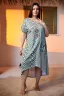 Платье женское, свободное, к низу расширенное. Рукав цельнокроенный короткий. Горловина Y-образная. Платье из двух полочек , одна полочка и кокетка спинки: в горошек, другая полочка и спинка: в полоску. На полочке в полоску большой накладной карман из ткани в горошек с декоративной кокосовой пуговицей на завязке. На полочке в горошек чуть ниже линии груди настрочены два хляста с декоративными кокосовыми пуговицами. На спинке сзади складка для обеспечения достаточной свободы по бедрам. Низ платья фигурный, полочка короче спинки.