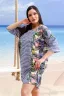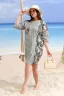 Платье женское прямого силуэта. Рукав цельнокроенный со швом, ниже локтя. Горловина округлая. Полочка и спинка состоят из двух ассиметричных частей из тканей-компаньонов:полоса и пальмы. На правой полочке кокетка и нагрудный карман. Низ фиксируется боковыми утяжками, продетыми в люверсы.