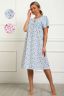 Сорочка женская из натурального набивного трикотажа, хлопок 100%. Силуэт свободный, расширенный к низу. Горловина круглой формы с капелькой по центру. Обработана окантовкой. Отделкой служит бантик. Рукав короткий, свободный. В верхней части оката выполнена небольшая сборка. Низ изделия прямой. Длина ниже колена.