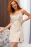 Сорочка на бретелях полуприлегающего силуэта, с фигурной линией низа, длиной выше колена. На полочке внизу обработан декоративный разрез. Проймы, бретели и разрез на полочке обработаны бейкой из основного полотна.
