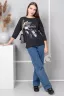 Джемпер из футера с лайкрой, круглая горловина обработана обтачкой, спущенная пройма, рукав 3/4. На спинке кокетка, низ спинки слегка удлинён и закруглён. Стильный принт и лампасы по боковым швам придают джемперу некую изюминку. Тёплый, комфортный джемпер для девушек любой фигуры и возраста